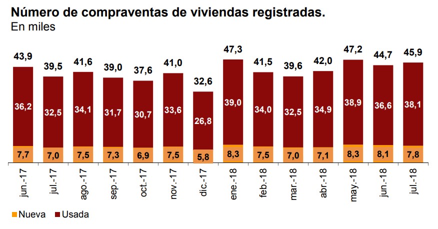 На рынок вторичного жилья пришлось 83,1% от общего числа сделок купли-продажи июля 2018 года, где было продано 38.120 объектов с годовым ростом 17,2%. С другой стороны, продажи новостроек увеличилась за год на 11,4%, до 7.780 операций.