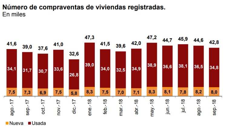 На рынок вторичного жилья пришлось 81,3% от общего числа сделок купли-продажи сентября 2018 года, где было продано 34.750 объекта с годовым ростом 9,6%. С другой стороны, продажи новостроек увеличилась за год на 9,8%, до 8.016 операций.