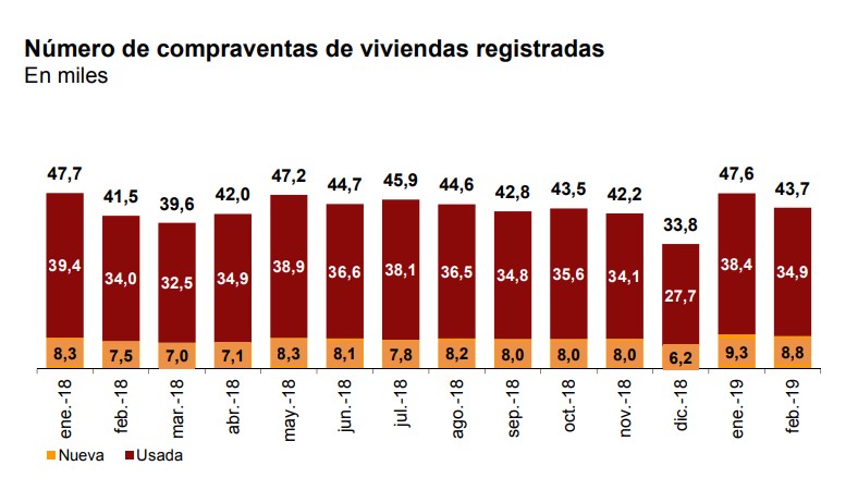На рынок вторичного жилья пришлось 79,9% от общего числа сделок купли-продажи февраля 2019 года, где было продано 34.899 объектов с годовым снижением на 0,2%. С другой стороны, продажи новостроек увеличились за год на 14,4%, до 8.796 операций.