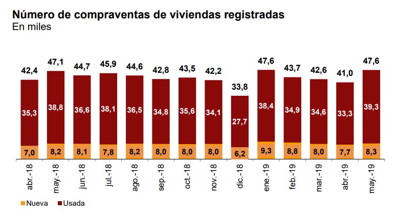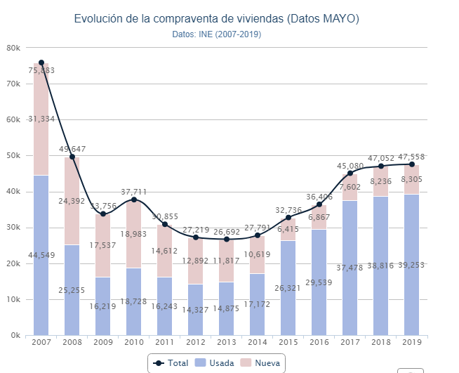 Количество сделок купли-продажи жилых объектов в Испании, зарегистрированных в Реестре прав собственности, в мае 2019 года выросло по сравнению с маем 2018 года на 1,1% и составило 47.558 операций, согласно данным, опубликованным Национальным институтом статистики (INE). Это является лучшим показателем за последние одиннадцать лет для этого месяца года, начиная с 2008 года, когда было продано 49.647 единиц жилья.