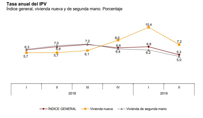 Цены на жилье в Испании продолжают расти хорошими темпами вот уже 21 квартал, но в последнее время это происходит насколько медленнее, согласно данным индекса цен на жильё (Índice de Precios de Vivienda - IPV), опубликованным сегодня Национальным Институтом статистики (INE). Так во втором квартале 2019 года цены на жилые объекты увеличились на 5,3%, по сравнению со вторым кварталом 2018 года. В предыдущем квартале рост цен в годовом выражении составил 6,8%, то есть динамика роста снизилась на 1,5 процентных пункта.