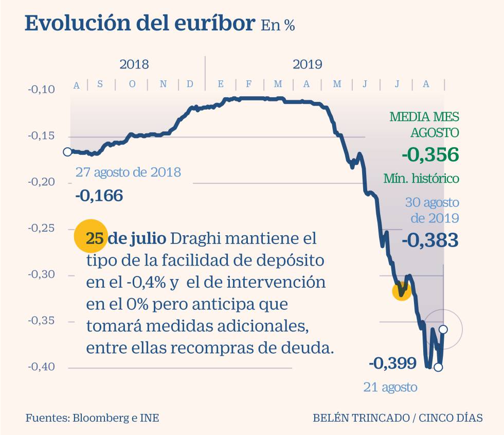 Поскольку год назад, в августе 2018 года, Euribor был гораздо выше (-0,169), чем в августе текущего года (-0,356), эта разница на 0,187 пункта сделает ипотечные кредиты, немного дешевле. Например, для ипотеки от 120 000 евро сроком на 20 лет и с дифференциалом Euribor + 1% ежемесячная комиссия будет снижена на 9,8 евро в течение следующего года или суммарно 117,6 евро в год.