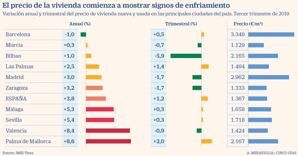 Еще один пример обобщенного рыночного торможения заключается в том, что ни в одном из десяти крупнейших городов страны цены не выросли в двузначном выражении, как это было в предыдущих кварталах. Наиболее важные повышения цен, в среднем 8%, произошли в Пальма-де-Майорке и Валенсии, которые, однако, меньше, чем рост за последние полтора года. Еще два города, Севилья и Малага, имели увеличение на 5%, в то время как в остальных рост был ниже этого порога: Сарагоса (3,2%), Мадрид (3%), Лас-Пальмас (2,5%), Бильбао (1%) и Мурсия (0,3%).