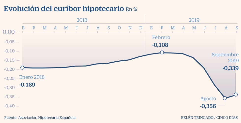 Ставка 12-месячного Euribor, наиболее широко используемый показатель для расчета ипотеки с переменной процентной ставкой в Испании, в сентябре 2019 года составила минус 0,339%. В августе индекс находился на историческом минимуме -0,356, в июле -0,283, в июне -0,190, мае -0,134, в апреле -0,112, в марте -0,109, в феврале -0,108. Таким образом, Euribor немного подрос после шестимесячного падения, и снова вернулась к восходящему тренду, при этом находясь уже 43 месяца подряд в зоне отрицательных значений.