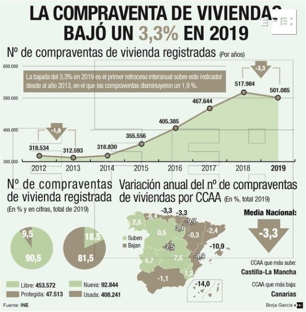 Количество сделок купли-продажи жилых объектов, зарегистрированных в Реестре прав собственности Испании в 2019 году, снизилось по сравнению с 2018 годом на 3,3% и составило 501.085 операций. В 2018 году этот показатель составил 517.984 операции, и был самым высоким с 2008 года (558,5 тыс. сделок).