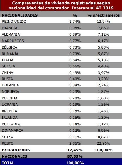 Жители Великобритании в 2019 года по-прежнему остаются лидерами среди зарубежных граждан по числу покупок жилой недвижимости в Испании. Из 63.000 единиц, которые иностранцы купили на испанской земле в течение 2019 года – 13,94% от общего числа или чуть менее 9 000 перешли в руки британцев.