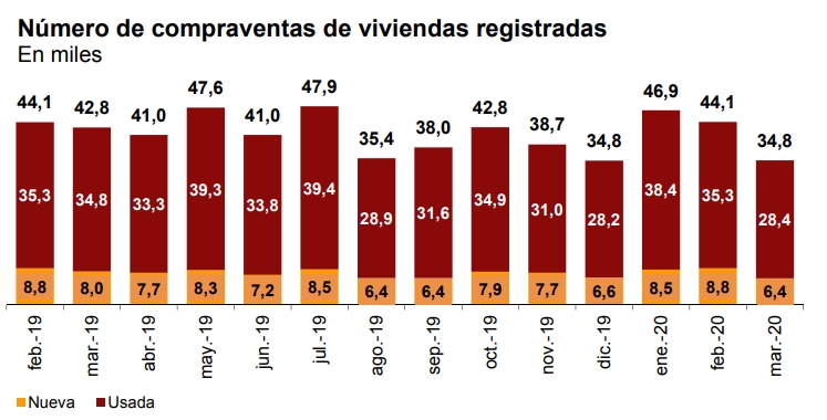 Количество сделок купли-продажи жилых объектов в Испании, зарегистрированных в Реестре прав собственности, в марте 2020 года, снизилось на 18,6% по сравнению с мартом 2019 года и составило 34.806 операций, что является самым низким мартовским показателем с 2016 года согласно данным, опубликованным сегодня Национальным институтом статистики (INE).