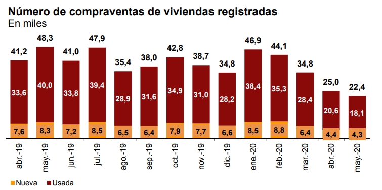 Количество сделок купли-продажи жилых объектов в Испании, зарегистрированных в Реестре прав собственности, в мае 2020 года снизилось на 53,7% по сравнению с маем 2019 года и составило 22.394 операции, что является самым низким показателем в этом месяце с 2007 года и самым низким показателем за любой месяц с ноября 2013 года.
