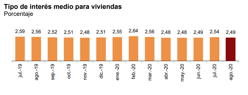 Средняя банковская ставка по ипотеке в августе 2020 года составила 2,49%, что на 2,73% ниже прошлогоднего августовского показателя, когда она составляла 2,56%.
