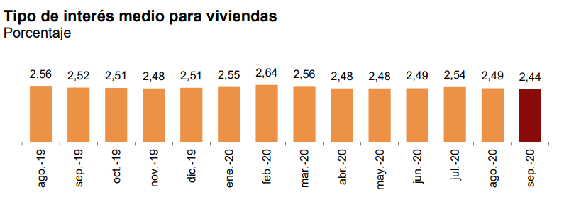 51,5% ипотечных кредитов на жильё было выдано под плавающий процент (tipo variable), который зависит от европейской межбанковской ставки предложения (Euribor), и 48,5% - под фиксированный (tipo fijo). Средняя процентная ставка для ипотеки с переменной ставкой составила 2,12%, по сравнению с 2,84% - для ипотеки с фиксированной ставкой.