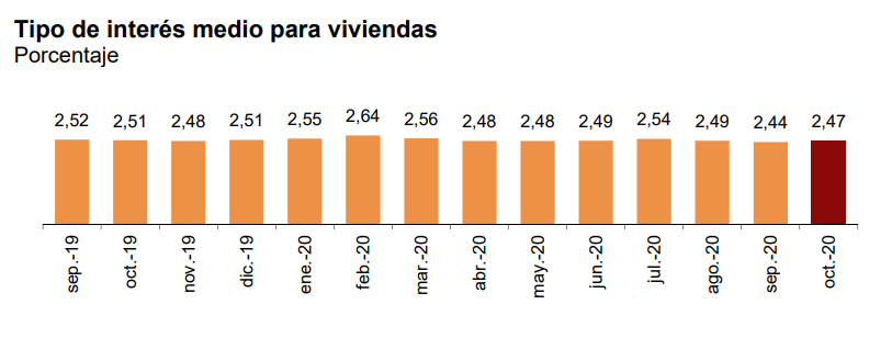 51,1% ипотечных кредитов на жильё было выдано под плавающий процент (tipo variable), который зависит от европейской межбанковской ставки предложения (Euribor), и 48,9% - под фиксированный (tipo fijo). Средняя процентная ставка для ипотеки с переменной ставкой составила 2,19%, по сравнению с 2,85% - для ипотеки с фиксированной ставкой.