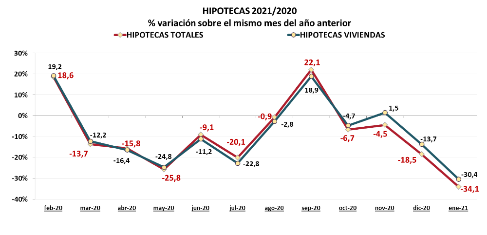 Кроме того, число ипотечных кредитов, выданных в январе текущего года, снизилось в годовом выражении на 30,4% до 26.002 операции, усугубив негативную тенденцию, полученную в декабре месяце прошлого года (-18,5%).