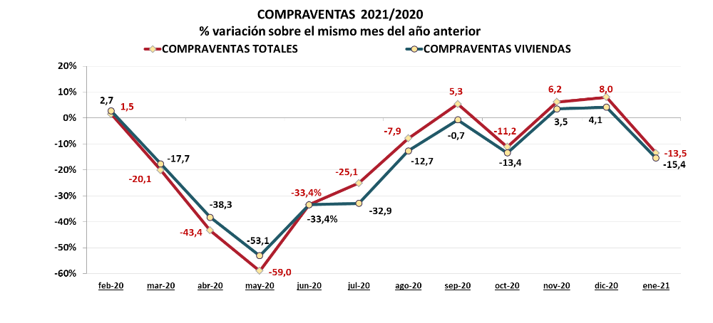 Прошлогодняя эволюция рынка продаж жилья демонстрирует его падение с начала пандемии в марте месяце, которое в мае достигло более 50%, после чего началось постепенное восстановление, прерванное только в октябре, продлившееся до декабря, когда был отмечен рост на 4,1%. Однако в январе текущего года падение вновь вернулось (-15,4%), показав цифры аналогичные октябрю прошлого года.