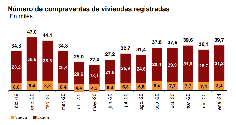 На рынок вторичного жилья пришлось 78,8% от общего числа сделок купли-продажи января 2021 года, где было продано 31.337 объектов. Годовое снижение этого сегмента составило 18,8%. С другой стороны, продажи новостроек снизились на 0,4%, до 8.416 операций.