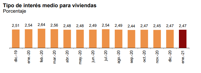 48,8% ипотечных кредитов на жильё было выдано под плавающий процент (tipo variable), который зависит от европейской межбанковской ставки предложения (Euribor), и 51,2% - под фиксированный (tipo fijo). Средняя процентная ставка для ипотеки с переменной ставкой составила 2,17%, по сравнению с 2,81% - для ипотеки с фиксированной ставкой.