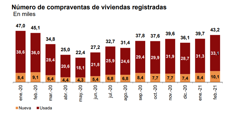Количество сделок купли-продажи жилых объектов, зарегистрированных в Реестре прав собственности Испании, в феврале 2021 года снизилось по сравнению с февралём 2020 года на 4,3%, и составило 43.185 операции, согласно данным, опубликованным сегодня Национальным институтом статистики (INE).