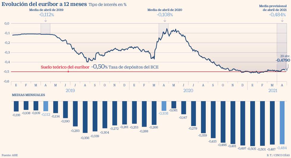 Ставка 12-месячного Euribor, основной ориентир для определения процентной ставки по ипотечным кредитам, предоставляемым испанскими кредитными организациями, составил в апреле 2021 года минус 0,484, что стало его третьим подряд повышением после восьми месяцев подряд падений.