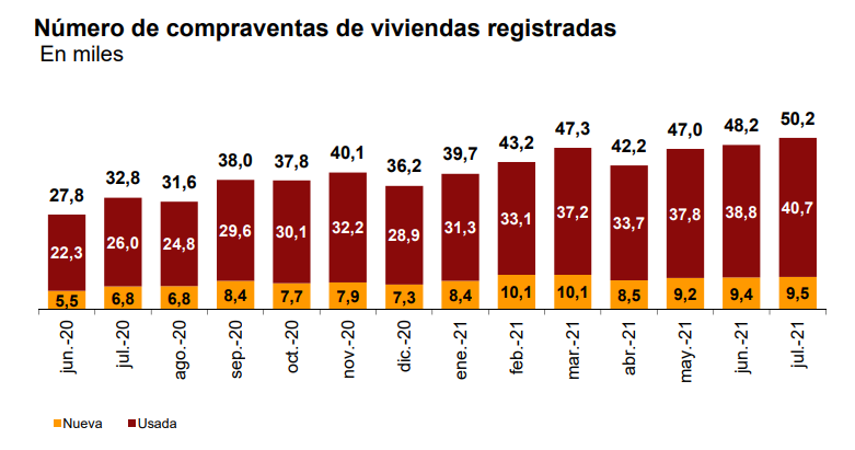 На рынок вторичного жилья пришлось 81,1% от общего числа сделок купли-продажи июля 2021 года, где было продано 40.748 объектов. Годовой рост этого сегмента составило 56,9%. С другой стороны, продажи новостроек выросли на 40,2%, до 9.510 операций.