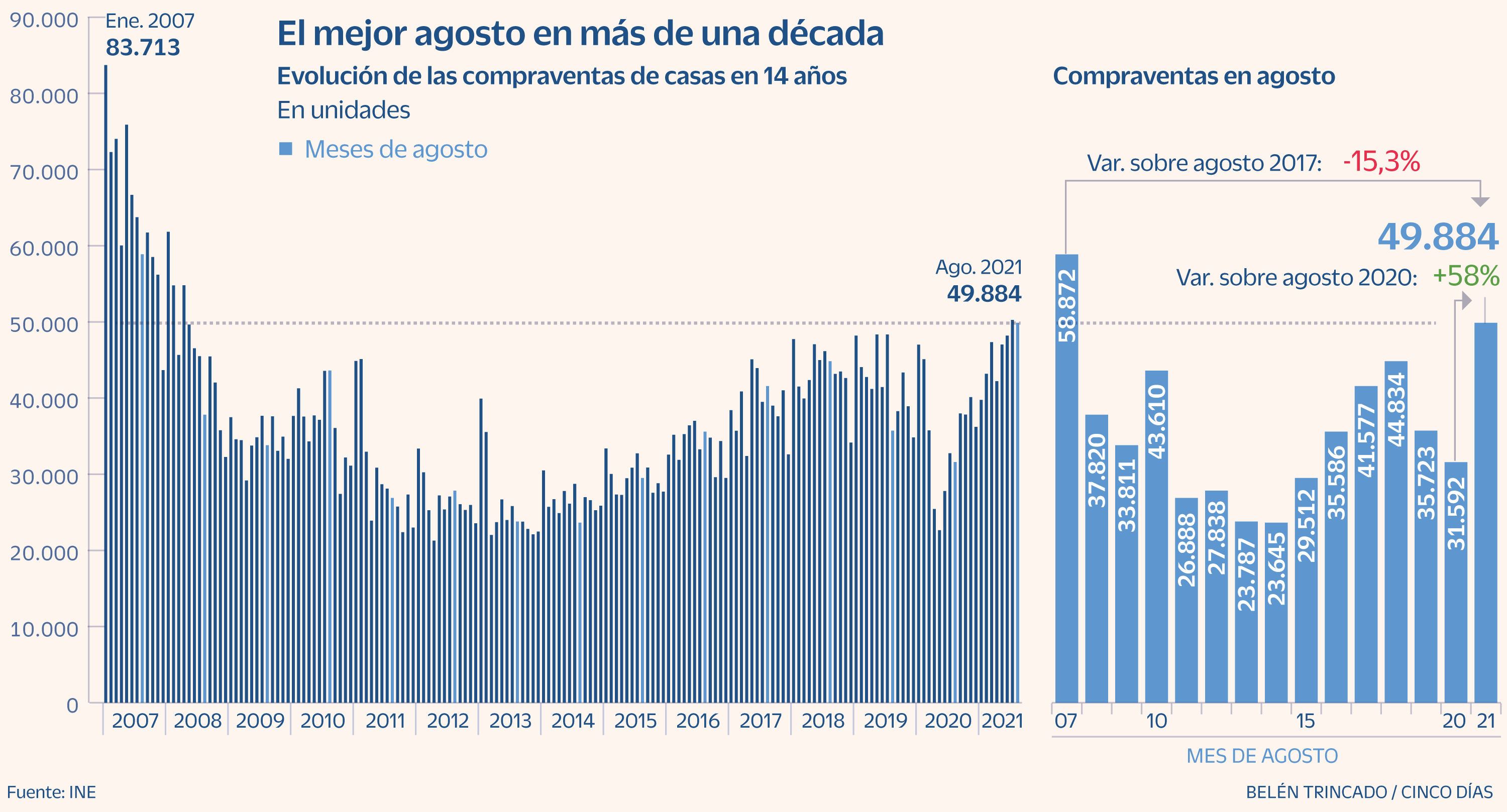 Сектор жилой недвижимости Испании продолжает восстанавливаться крейсерскими темпами после самых тяжелых месяцев экономического кризиса и кризиса, вызванного Covid-19. Количество сделок купли-продажи жилых объектов, зарегистрированных в Реестре прав собственности Испании, в августе 2021 года выросло по сравнению с августом 2020 года на 57,9%, и составило 49.884 операции, что является самым высоким показателем за август с 2007 года (58.872), согласно данным, опубликованным сегодня Национальным институтом статистики (INE).