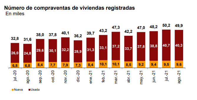На рынок вторичного жилья пришлось 80,7% от общего числа сделок купли-продажи августа 2021 года, где было продано 40.275 объектов. Годовой рост этого сегмента составило 62,6%. С другой стороны, продажи новостроек выросли на 40,9%, до 9.609 операций.