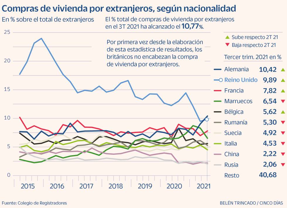 Согласно данным, опубликованным вчера Коллегией регистраторов, покупки жилья иностранцами в Испании, упавшие до 9,7% в первом квартале 2021 года, продолжают расти второй квартал подряд, и в третьем квартале рост составил 10,8%, что соответствует уровню конца прошлого года.