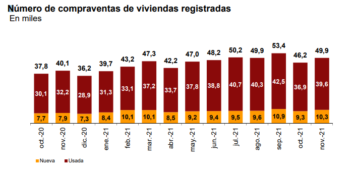 На рынок вторичного жилья пришлось 79,3% от общего числа сделок купли-продажи ноября 2021 года, где было продано 39.554 объектов. Годовой рост этого сегмента составило 22,9%. С другой стороны, продажи новостроек выросли на 30,5%, до 10.341 операций.