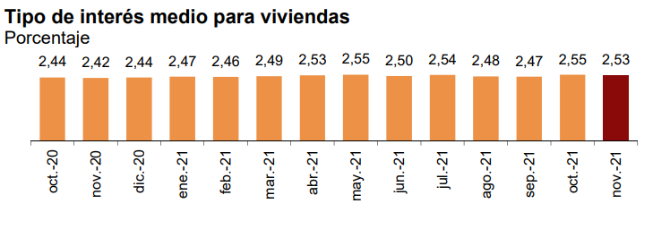 32,5% ипотечных кредитов на жильё было выдано под плавающий процент (tipo variable), который зависит от европейской межбанковской ставки предложения (Euribor), и 67,5% - под фиксированный (tipo fijo).