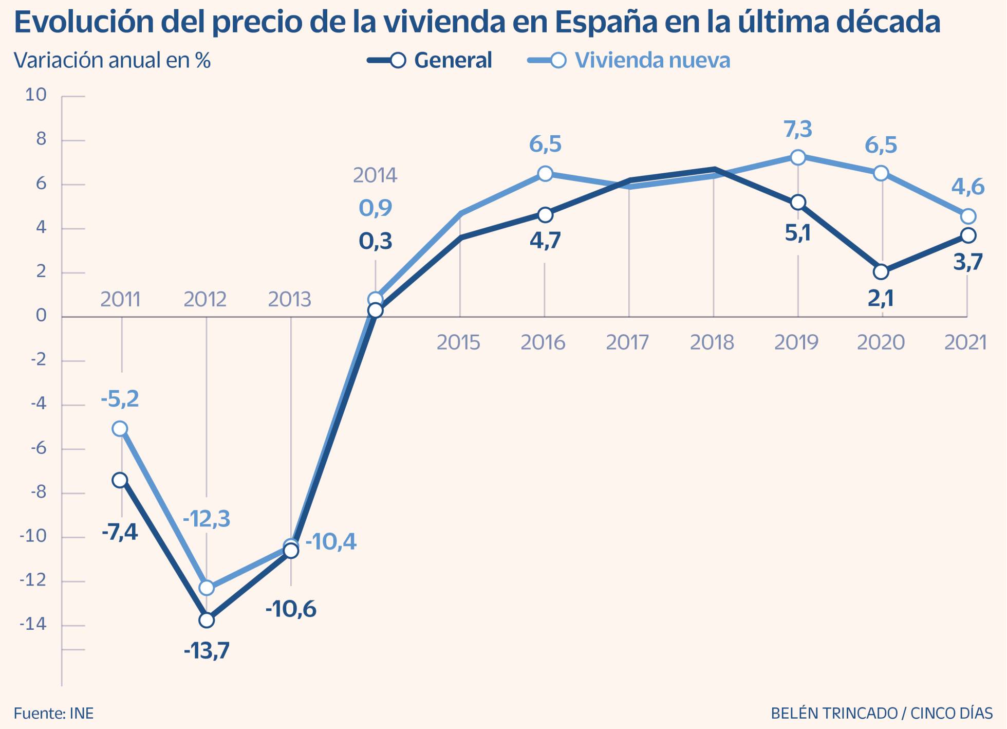 Если проанализировать эволюцию последнего десятилетия, то можно заметить, что в период с 2008 по 2013 год, в разгар экономического кризиса, цены на жилье в Испании ежегодно падали разной интенсивности, достигнув исторического минимума в 2012 году. В 2014 году динамика цен вернулась к положительным показателям со среднегодовым приростом 0,3%, который в 2015 г. ускорился до 3,6% и достиг максимума в 2018 г. (6,7%).