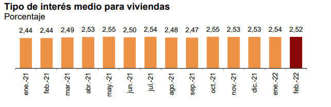 26,2% ипотек было выдано под плавающий процент (tipo variable), который зависит от европейской межбанковской ставки предложения (Euribor), и 73,8% - под фиксированный (tipo fijo). Средняя процентная ставка для ипотеки с переменной ставкой составила 2,09%, по сравнению с 2,68% - для ипотеки с фиксированной ставкой.