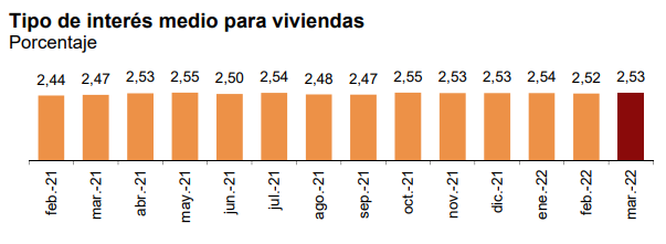 27,3% ипотек было выдано под плавающий процент (tipo variable), который зависит от европейской межбанковской ставки предложения (Euribor), и 72,7% - под фиксированный (tipo fijo). Средняя процентная ставка для ипотеки с переменной ставкой составила 2,15%, по сравнению с 2,68% - для ипотеки с фиксированной ставкой.