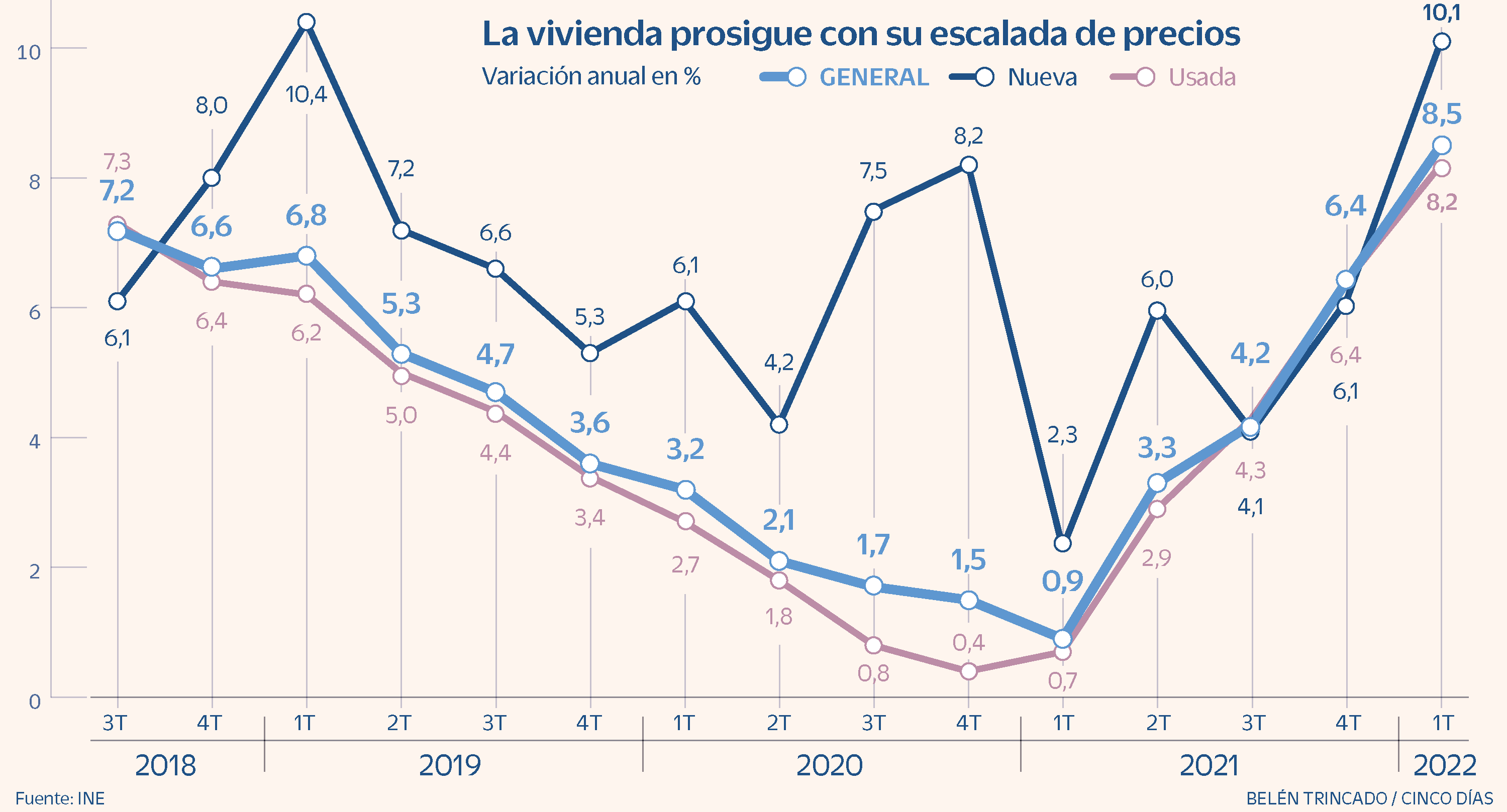 Цены на жилье в Испании выросли в первом квартале 2022 года на 8,5% в годовом исчислении, что более чем на два пункта выше предыдущего квартала и является самым большим ростом с сентября 2007 года, согласно индексу цен на жилье (IPV), опубликованным сегодня Национальным Институтом статистики (INE)