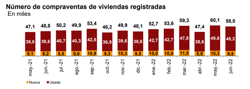 На рынок вторичного жилья пришлось 83,1% от общего числа сделок купли-продажи июня 2022 года, где было продано 48.188 объектов. Годовой рост этого сегмента составило 21,5%. С другой стороны, продажи новостроек выросли на 7,1%, до 9.822 операции.