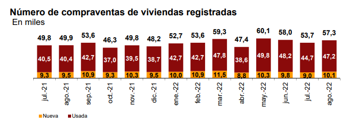 На рынок вторичного жилья пришлось 83,3% от общего числа сделок купли-продажи августа 2022 года, где было продано 47.206 объектов. Годовой рост этого сегмента составило 17,0%. С другой стороны, продажи новостроек выросли на 6,1%, до 10.121 операцию.