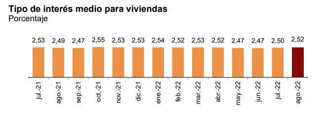 28,1% ипотек было выдано под плавающий процент (tipo variable), который зависит от европейской межбанковской ставки предложения (Euribor), и 71,9% - под фиксированный (tipo fijo). Средняя процентная ставка для ипотеки с переменной ставкой составила 2,09%, по сравнению с 2,71% - для ипотеки с фиксированной ставкой.