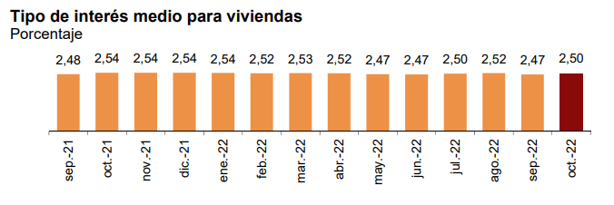 33,2% ипотек было выдано под плавающий процент (tipo variable), который зависит от европейской межбанковской ставки предложения (Euribor), и 66,8% - под фиксированный (tipo fijo). Средняя процентная ставка для ипотеки с переменной ставкой составила 2,03%, по сравнению с 2,74% - для ипотеки с фиксированной ставкой.