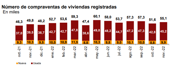 На рынок вторичного жилья пришлось 82,0% от общего числа сделок купли-продажи ноября 2022 года, где было продано 45.199 объектов. Годовой рост этого сегмента составило 14,3%. С другой стороны, продажи новостроек снизились на 3,0%, до 9.933 операций.