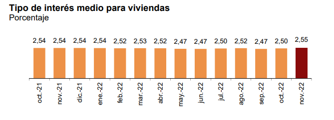 34,6% ипотек было выдано под плавающий процент (tipo variable), который зависит от европейской межбанковской ставки предложения (Euribor), и 65,4% - под фиксированный (tipo fijo). Средняя процентная ставка для ипотеки с переменной ставкой составила 2,12%, по сравнению с 2,80% - для ипотеки с фиксированной ставкой.