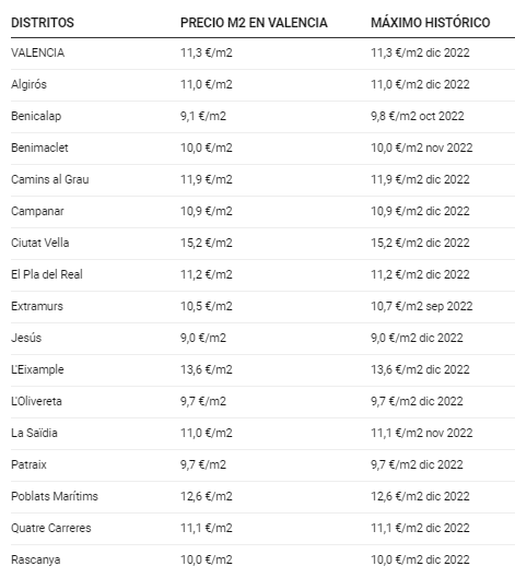 Таким образом, наибольшая стоимость аренды была в центре Валенсии (такие кварталы, как la Seu, Ruzafa, Gran Vía, la Xerea, el Carmen, el Pla del Remei, el Pilar, el Mercat o Sant Francesc), в районах университета (Ayora, Albors) и рядом с пляжем (Cabanyal, Nazaret, Beteró o Malvarrosa).