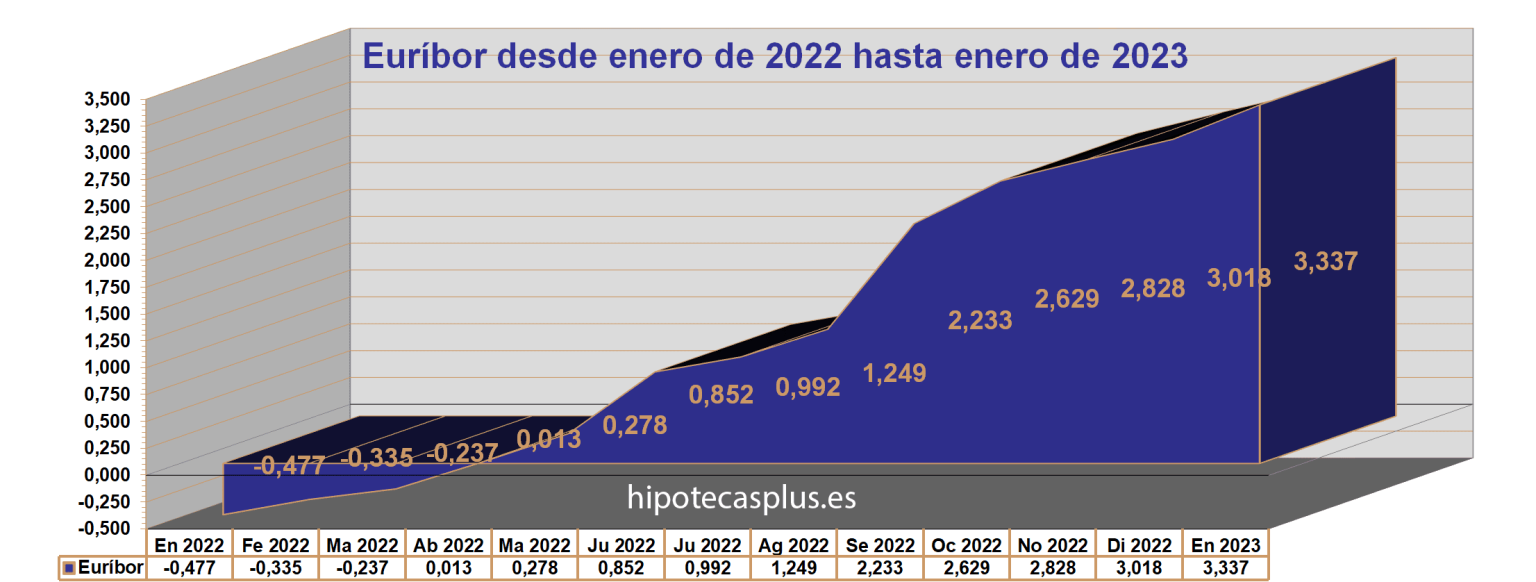 Ставка 12-месячного Euribor, основной ориентир для определения процентной ставки по ипотечным кредитам, предоставляемым испанскими кредитными организациями, сохраняет уверенный темп роста и составила в январе 2023 года 3,337%.