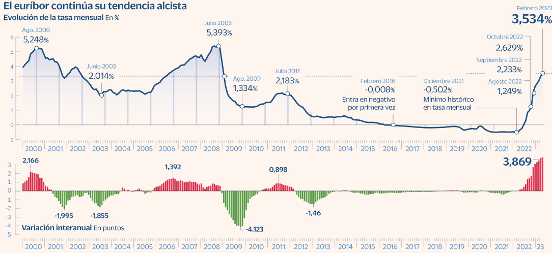 Ставка 12-месячного Euribor, основной ориентир для определения процентной ставки по ипотечным кредитам, предоставляемым испанскими кредитными организациями, сохраняет уверенный темп роста и составила в феврале 2023 года 3,534%, что является самым высоким показателем с ноября 2008 года.