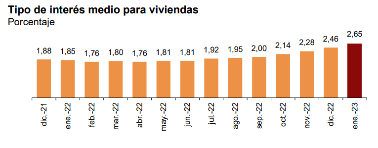 32,6% ипотек было выдано под плавающий процент (tipo variable), который зависит от европейской межбанковской ставки предложения (Euribor), и 67,4% - под фиксированный (tipo fijo). Средняя процентная ставка для ипотеки с переменной ставкой составила 2,38%, по сравнению с 2,79% - для ипотеки с фиксированной ставкой.