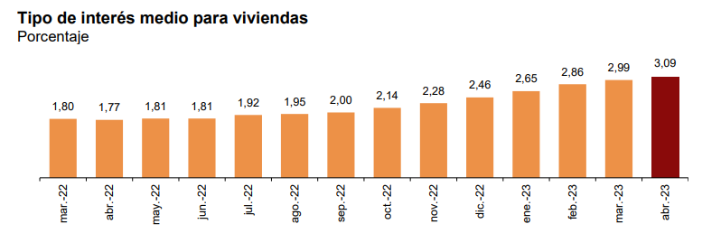 Таким образом, после непрерывного повышения регулирующих ставок Европейским центральным банком (ЕЦБ) с июля прошлого года, чтобы попытаться сдержать инфляцию, средняя процентная ставка по ипотечным кредитам, предназначенным для покупки домов, стала дороже за один год на 1,32 процентных пункта, и уже превысила 3%.