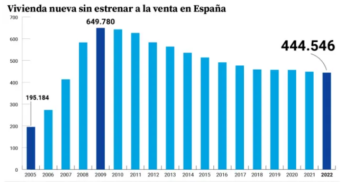 Об этом свидетельствуют данные о количестве нового непроданного жилья, ежегодно публикуемые Министерством транспорта, мобильности и развития городов. По состоянию на 31 декабря 2022 года в Испании насчитывалось в общей сложности 444. 546 домов, что составляет 1,7% от общего жилищного фонда, состоящего из 26 миллионов единиц недвижимости, большинство из которых были первыми домами.