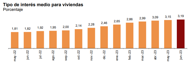 40% ипотек на жильё было выдано под плавающий процент (tipo variable), который зависит от европейской межбанковской ставки предложения (Euribor), и 60% - под фиксированный (tipo fijo). Средняя процентная ставка для ипотеки с переменной ставкой составила 2,84%, по сравнению с 3,45% - для ипотеки с фиксированной ставкой.
