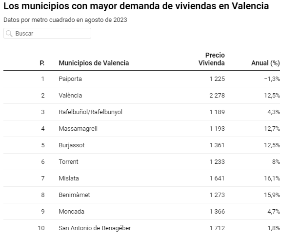 Так, город Валенсия имеет самые высокие цены в одноимённой провинции, но наиболее востребованные муниципалитеты находятся менее чем в 15 минутах от столицы провинции. Например, Паипорта лидирует по спросу на дома, выставленные на продажу, но в последнее время особенно вырос спрос в таких населенных пунктах района L'Horta Nord, как Рафельбуньол (где для строительства высвободилось большое количество земли и зафиксирована самая низкая цена за квадратный метр) или Массамагрель, оба связаны метро с центром города и находятся всего в 12-15 километрах по дороге, с сообщением через V-21 и объездную дорогу.