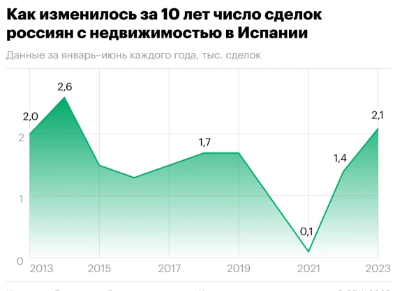 Граждане России, которые не являются резидентами Испании, совершили в первом полугодии 2023 года 690 сделок с недвижимостью, что на 61,6% больше, чем в аналогичный период прошлого года (427 сделок). Число сделок, совершенных россиянами — резидентами Испании, также выросло в этот перод на 45,3% и составило 1447, то есть фактически достигло допандемийных показателей.