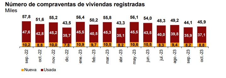 На рынок вторичного жилья пришлось 80,7% от общего числа сделок купли-продажи октября 2023 года, где было продано 37.056 объектов. Годовое падение этого сегмента составило 13,5%. С другой стороны, продажи новостроек выросли на 0,8%, до 8.847 операций.