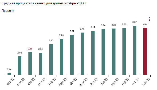 INE отмечает, что процентная ставка по ипотеке превышает 3% уже восьмой месяц подряд, хотя в текущем ноябре впервые за последний год зафиксировано её снижение, поскольку с декабря 2022 года этот показатель начал интенсивный рост, что привело в октябре 2023 года к установлению рекордного показателя за восемь лет (3,32%).