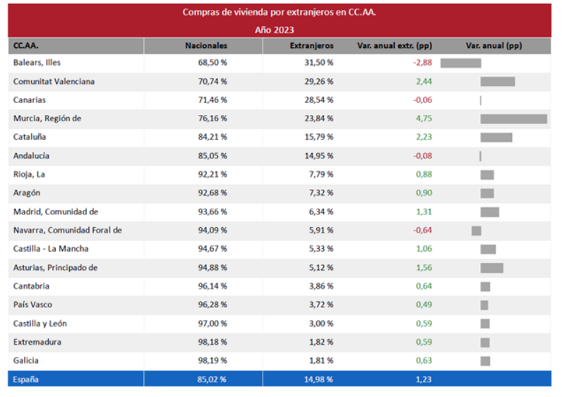 Автономные сообщества с самым высоким весом покупок со стороны иностранцев снова совпадают с автономными сообществами с высокой туристической активностью, во главе с Балеарскими островами (31,7%), за которыми следуют Валенсийское сообщество (29,3%), Канарские острова (28,5%) и Мурсия (23,8%).