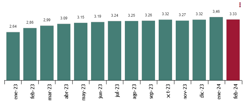 Средняя банковская ставка по жилищной ипотеке несколько снизилась по сравнению с предыдущим месяцем, но всё ещё находится на рекордном за 9 лет уровне и превышает 3% одиннадцатый месяц подряд. В частности в феврале 2024 года она составила 3,33% по сравнению 3,46% в предыдущем месяце, когда она достигла самого высокого значения с декабря 2014 года.